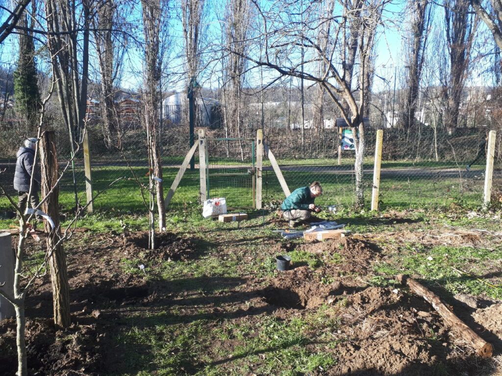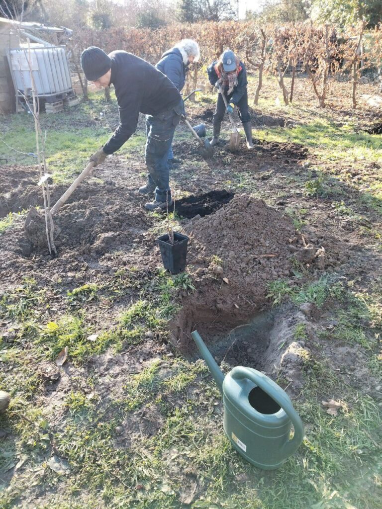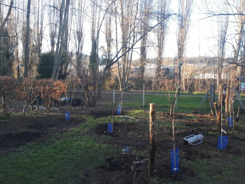 🌱Les arbres étaient fournis par la Haie Magique, à l’exception de 2 poiriers et 2 kiwis que nous avons achetés et d’un Kaki que nous avons récupéré d’un jardin d’un particulier (un sauvetage d’un arbre déjà assez grand !) : merci Ghislain pour ces beaux spécimens !